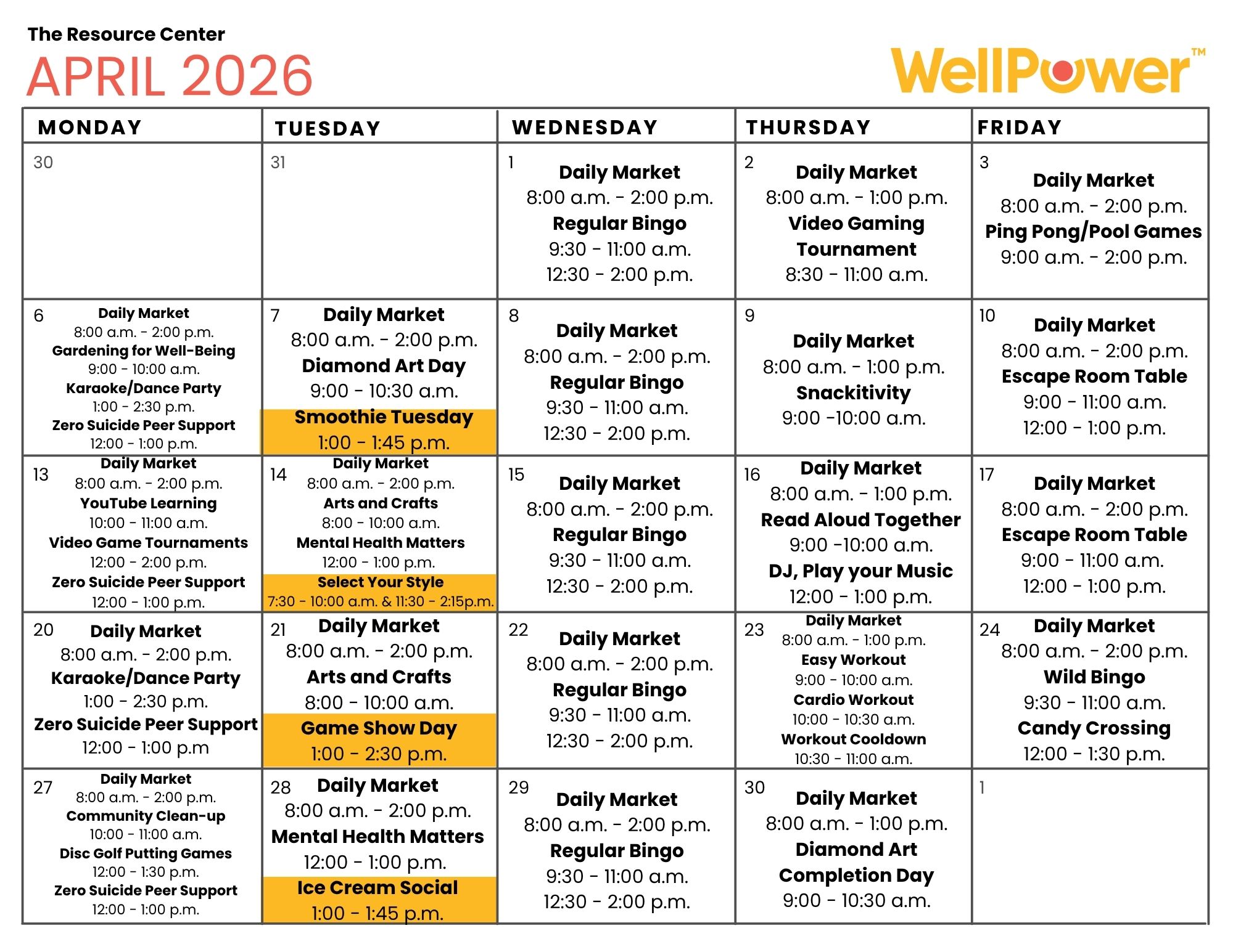 WellPower's Resource Center has been reimagined to better work with our community's needs. Where we previously had separate Resource Centers for adults we serve and children and families we serve, we have now merged into one program. With extended hours, clearer drop-in times, more opportunities to use our Shopette and updates to our Daily Market (formerly our foodbank), we hope these changes will continue to serve our community well.