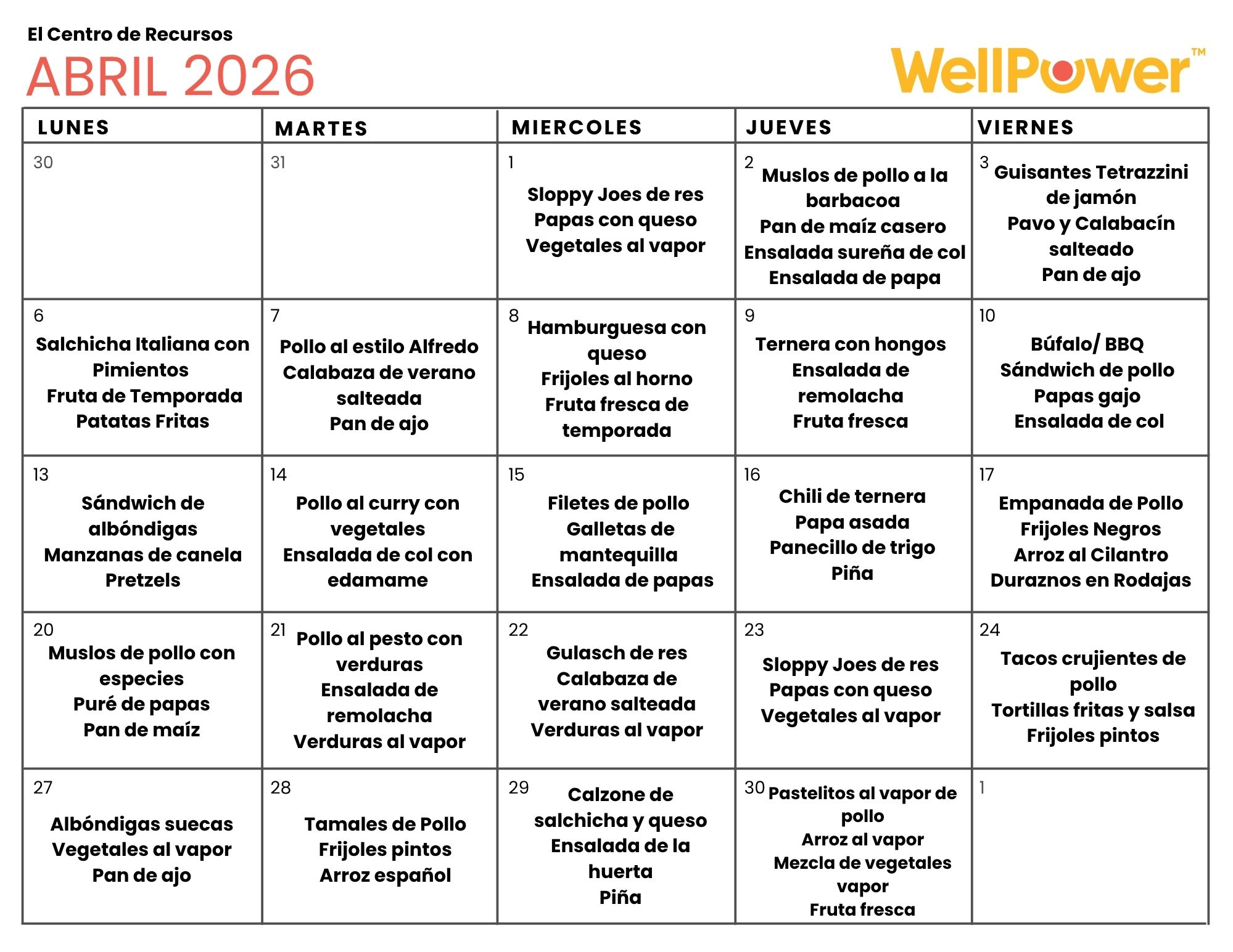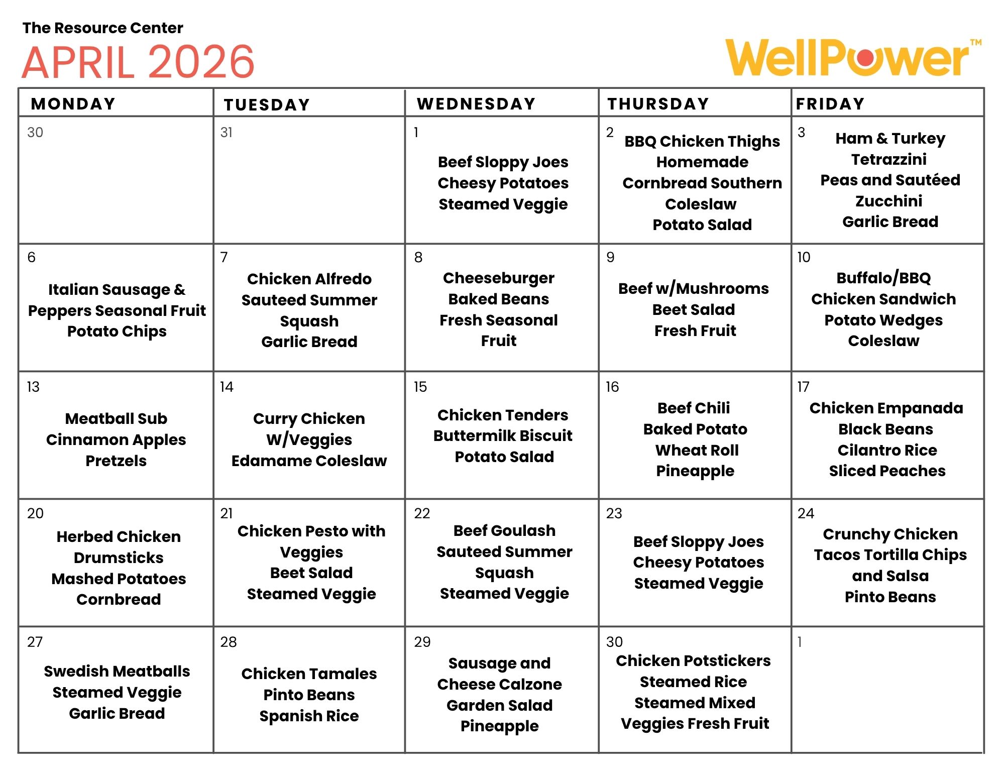 We are excited to provide a monthly lunch menu to people we serve at the Resource Center. Please click on the image below to see the calendar larger, or click on the buttons to download a copy of the menu as a PDF.